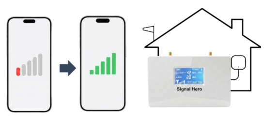 Signal Hero mobile signal booster is the only working solution if you have a weak signal and dead zones. It helps to improve signal strength so you can access the internet more quickly, and stream videos without buffering. With our booster you can make and receive calls without interruption, ensuring you're always in touch with your family and friends. In general, the booster catches the signals from the nearest cell tower in the area by the external antenna which is included in the kit, then it sends the signal to the booster box. The box amplifies the signals, ensuring reliable coverage even in areas with poor signal strength, and the internal antenna spreads the signals inside the closed area.